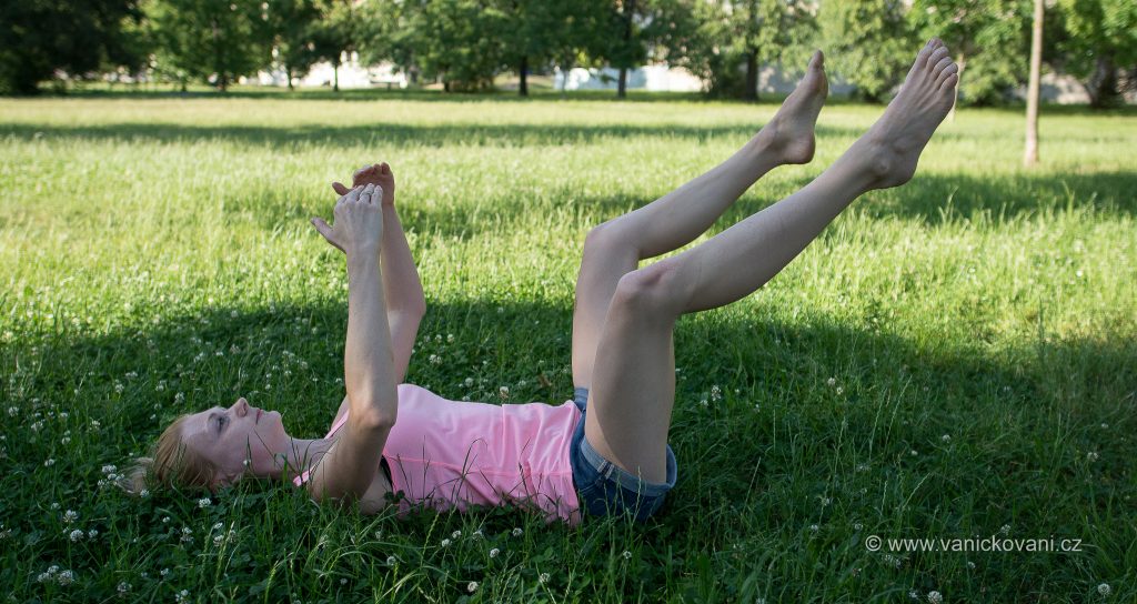 - Ležíme v poloze na zádech, ruce podél těla. Zvedáme hlavu a současně přitahujeme špičky nohou. Pravidelně dýcháme – při položení hlavy se nadechujeme a při jejím zvednutí vydechujeme. Opakujeme desetkrát.