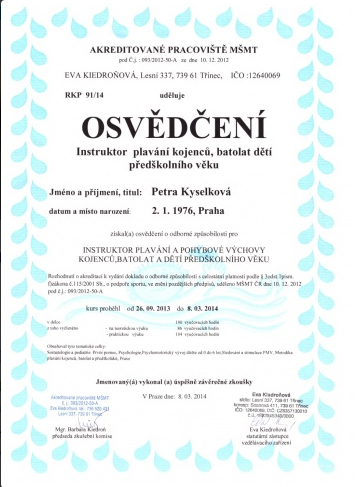 Petra má zkušenosti s problémy při koupání. Je také stálou instruktorkou kojeneckého plavání v Bybyclubu Čochtánek v Benešově. A v Praze na Chodově v Aqua spor Clubu. V Benešově v MC Hvězdička také vede cvičení miminek do 1 roku. Jako maminka tří dětí má zkušenosti a pochopení se vším co mateřství provází – s nevyspáním, únavou, psychickým i fyzickým vyčerpáním. Petra vlastní certifikáty: Instruktor plavání kojenců, batolat a dětí předškolního věku, Instruktor fitness a osobní trenér, a cvičení v těhotenství. Účastnila se také semináře o vaničkování.